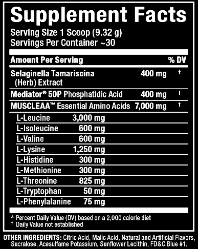 MUSCLEAA عبارة عن مصفوفة EAA كاملة الطيف تتميز بـ 7000mg EAAs ، بما في ذلك 4200mg BCAAs في نسبة مدعومة علميًا تظهر لزيادة بناء العضلات وفقدان الدهون. إن تضمين 400 ملغ من Mediator® Phosphatitic Acid و 400mg Selaginella Tamariscina Extract يضاعف فعالية مصفوفة EAA.
