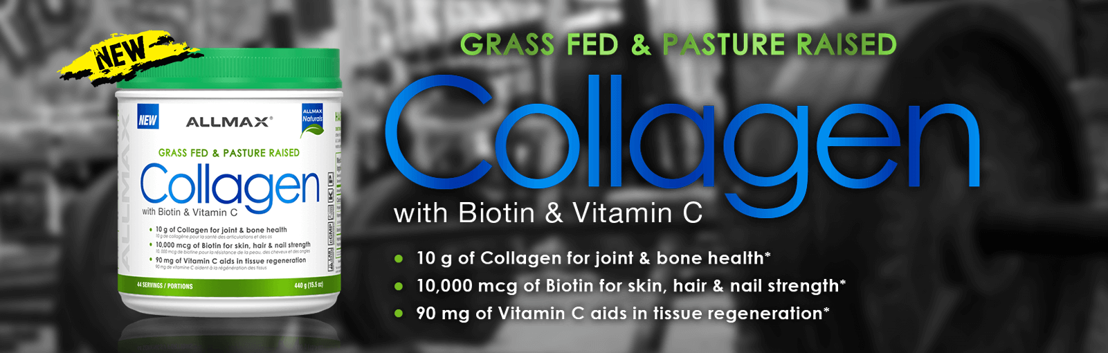 The ALLMAX Naturals line introduces all-new sourced from Grass-Fed and Pasture-Raised cows, Collagen Powder with added Biotin and Vitamin C. Our Collagen Protein is derived from Hydrolyzed Collagen Protein Peptides, giving you 9 g of protein in every scoop. Collagen is essential for the production of connective tissue and provides support for healthy joints, hair, nails, and skin. What makes ALLMAX Naturals Collagen so special? Our triple-action formula not only contains Collagen but the added benefits of Vitamin C that aids in the synthesis of Collagen along with Biotin for extra support in the formation of healthy hair, nails and skin.