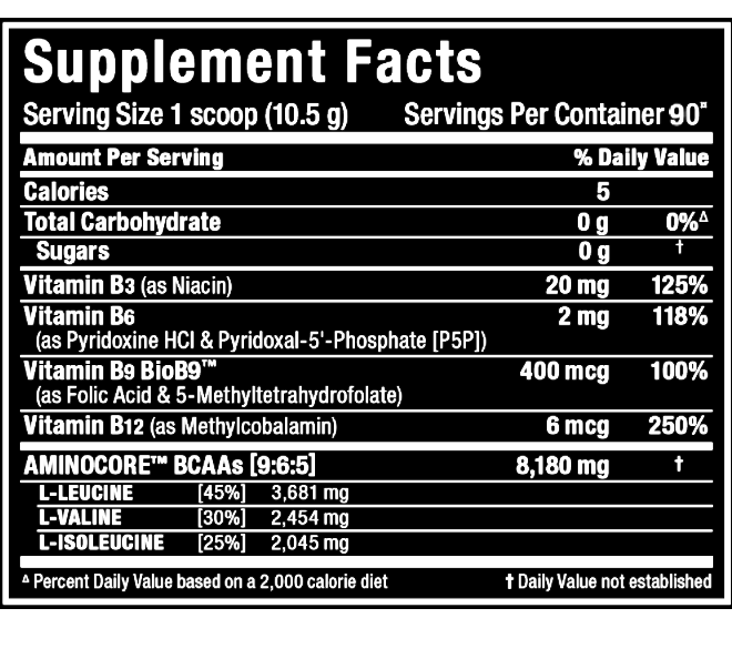 AMINOCORE delivers 8.18g of BCAA in a 45:30:25 ratio clinically proven to provide a 350% increase in activation of muscle growth signals. The purest, free-form source of BCAA, AMINOCORE has no added fillers or non-BCAA aminos. AMINOCORE’s BCAAs are 100% pure prior to flavoring. Typical 2:1:1 sources contain impurities resulting in cloudiness, oily foam, sediment, and the worst – a harsh bitter taste! AMINOCORE is the cleanest, purest, best-tasting BCAA supplement money can buy.