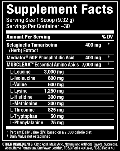 MUSCLEAA is a full spectrum EAA matrix featuring 7000mg EAAs, including 4200mg BCAAs in a scientifically supported ratio shown to maximize muscle building and fat loss. The inclusion of 400mg Mediator® Phosphatitic Acid and 400mg Selaginella Tamariscina Extract DOUBLES the effectiveness of the EAA matrix.